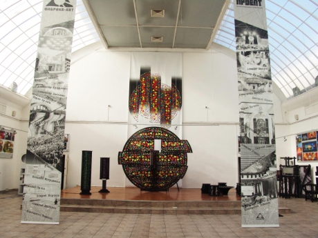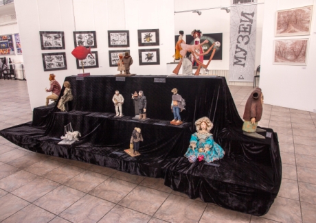 Большой зал выделен дополнительным структурным кольцевым объемом, в котором графические листы Юрия Пильстрова, рисунки Витольда Явшица и сочные, цветные пастели Наталии Петровой органично связаны с объемными образами кукол Татьяны Баевой, Натальи Побединой , Димы ПЖ и др.